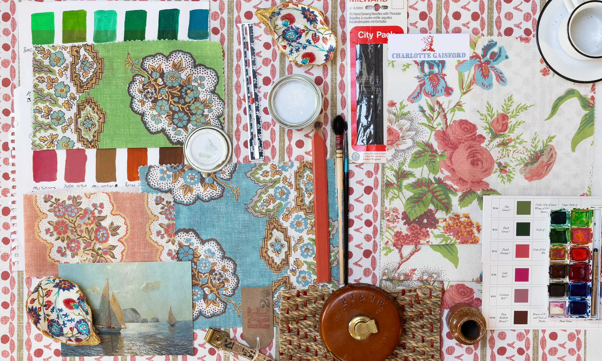 I design all my fabrics and wallpapers from my studio in rural Northumberland. My inspiration comes from everywhere, visits to museums, travels abroad, family heirlooms discovered in a chest of drawers. Each pattern tells a story, combining traditional English style with bold, cheerful colours.
