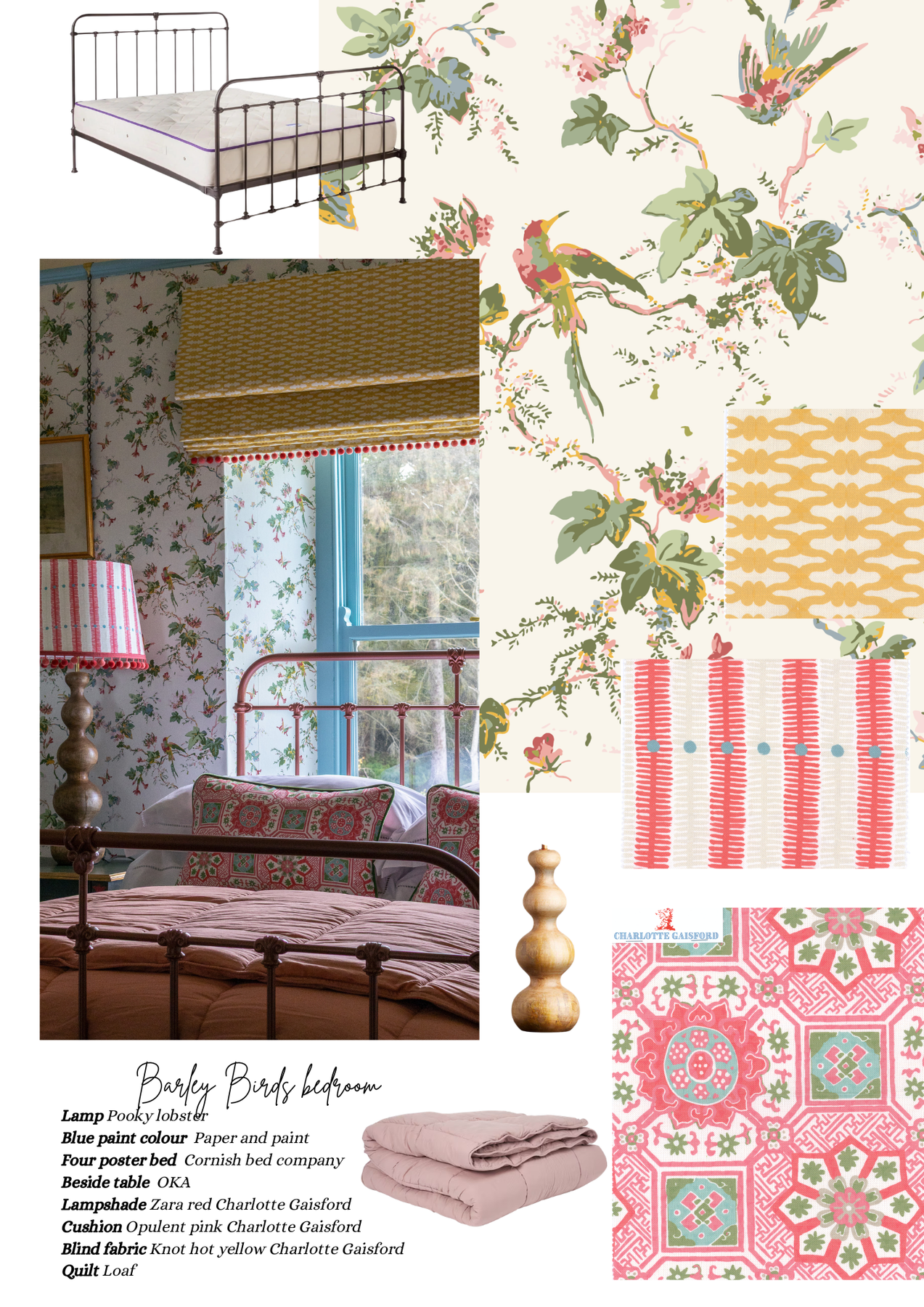 Barley Birds is a pretty painterly design depicting birds flying amongst the ivy. This wallpaper is Charlotte's version of a wallpaper she found in an old house on the Northumbrian coast. Charlotte thinks the original design might have been from a 50-60s wallpaper, which is long since been out of print, because Charlotte can find no reference to it anywhere. Charlotte says she is always careful when creating a representation of an old design, Charlotte likes to always know the history behind a design but she loves creating design archaeology and making her version using more modern colours.