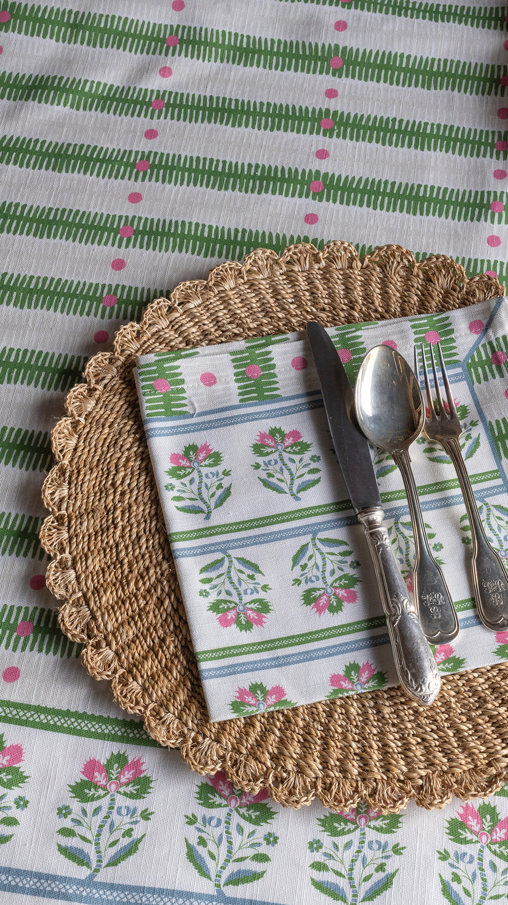 Charlotte diseñó estos manteles para que tengan un tamaño generoso y sean lavables a máquina, ofreciendo practicidad sin comprometer la elegancia.