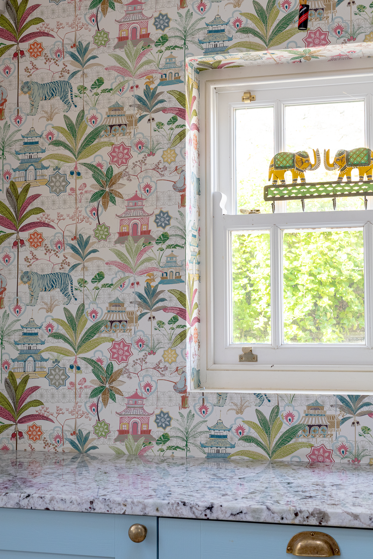 This wallpaper originally started out as just being available in fabric. I tested it out as a wallpaper and it is now one of my best sellers. I have sold it all over the world and I am still selling rolls and rolls all over the world. I designed it quite quickly, it came together so well, it was meant to be! it has been used in cloakrooms, hallways, kitchens, bedrooms, conservatories, just to name a few areas. I created it by drawing lots of motifs, I sketched designs from oriental furniture I had, and from other bits and pieces in my house. I hope it tells a story, showing the man fishing and the tiger watching behind him. I designed the tiger using the colours it appears in now but I was intending to change the colours when I started putting the pattern together. I didn’t want an orange tiger so I kept the blue colour and that is why the wallpaper is called Blue Tiger.